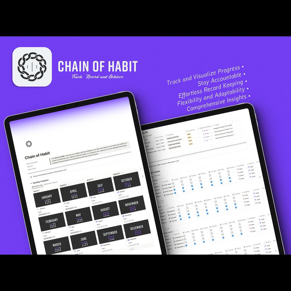 π Discover the Power of Habits with Chain of Habit! Track, Record, and Achieve Your Goals Like Never Before! π Are you tired of struggling to maintain consistency with your habits? Do you find it challenging to stay motivated and track your progress effectively? Look no further! Introducing Chain of Habit, the ultimate digital companion that revolutionizes the way you build and maintain habits. Unleash the potential within you and unlock the key to lasting personal growth. π The Metaphorical Chain of Success π Imagine your habits as links in a powerful chain, connecting your aspirations, dreams, and daily actions. With Chain of Habit, you can effortlessly track and visualize your habits, making continuity stable and progress tangible. Watch as your chain grows stronger with each successful habit, forging an unbreakable path towards success. ποΈ Monthly Analytics: Gain Valuable Insights π The Monthly Analytics feature in Chain of Habit empowers you with a bird's-eye view of your habits. Witness your monthly progress unfold before your eyes as the progress bar calculates how many days have passed, keeping you motivated and accountable. Effortlessly add new habits and watch them seamlessly integrate into your monthly progress, creating a comprehensive snapshot of your journey. π‘ Habit DB: Your Personal Record Keeper π Kickstart your habit-building journey with the Habit DB database. This is where your record-keeping and tracking begin. Easily add habits with the click of a button, specifying their category, frequency, start date, and goal. With two visually appealing and user-friendly views to choose from, Habit DB ensures you stay organized and focused on your goals. Get ready to embrace positive change! π Habit Tracker: Stay on Course, Stay Committed π― Track your habits effectively with the Habit Tracker database. Filtered on a monthly basis, this powerful tool showcases your habits for the current month, neatly grouped for clarity. Mark daily checkboxes to keep yourself accountable and motivated. If a habit no longer serves you, delete it effortlessly, ensuring a clutter-free and streamlined tracking experience. Your habits are just a few taps away! π The "New Habit" Page: Your Personal Habit Hub π Each habit deserves its own dedicated space, and the "New Habit" page in Chain of Habit provides just that. Fill in vital habit information, then create a monthly cycle to gain a clear view of your progress. Dive into the Daily View, where weekly checkboxes await your triumphs. Explore the Weekly View for a comprehensive progress overview. The SkipDay View lets you plan for flexibility, while the Monthly View celebrates your achievements on a grand scale. β¨ A Journey of Self-Discovery and Growth β¨ Embark on a transformative journey with Chain of Habit. Explore the vast depths of habit research, immerse yourself in inspiring stories of triumph, and tap into the power of consistency. Let this meticulously crafted digital template be your guiding light as you unlock your true potential and transform your life, one habit at a time. π Take Control of Your Destiny Today! π With Chain of Habit, you hold the key to lasting change. Embrace the power of habits, unlock your potential, and witness remarkable transformations in all areas of your life. Don't let procrastination and inconsistency hold you back any longer. Begin your journey now and become the best version of yourself. The time for change is hereβseize it with Chain of Habit! π Unlock the Power of Consistency - Purchase Chain of Habit Now! π If you're interested in staying up-to-date on the latest AI news, trends, and Notion tools, be sure to follow us on social media! I regularly share FREE Notion templates, articles, insights, and industry updates on my accounts, so you won't want to miss out. Here are links to our accounts: Follow the opportunities β Join me on my Twitter journey!Free content and tutorials β Jump to my Facebook GroupAre u use Instagram? β Follow meDid it benefit you? β Leave a short testimonial Thanks for your support, and let's connect on social media! π€π