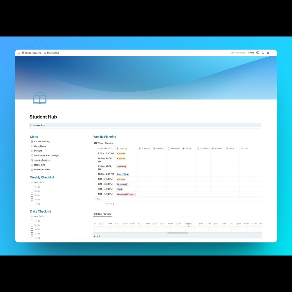 Are you a student looking to level up your organizational game and maximize your academic success? Look no further than "Student Hub," a meticulously designed Notion template created with your needs in mind. This digital toolkit serves as your ultimate companion, offering a range of essential pages and features to streamline your student life. Course Planning: Stay on top of your classes with this dedicated page that helps you map out your semesters, track credits, and plan your study schedule.Class Notes: Effortlessly organize and access your lecture notes, readings, and study materials all in one place. Take advantage of powerful tools for effective note-taking and revision.Persona (in resume): Craft a compelling resume that highlights your unique skills and experiences, tailored specifically for the job or internship you're targeting.What to Pack for College?: Get a comprehensive checklist of all the essentials you need to pack before heading off to college, ensuring a smooth transition to campus life.Job Applications: Simplify your job application process with a dedicated page that helps you keep track of job openings, application deadlines, and your progress in the hiring process.Networking: Build valuable connections with peers, mentors, and professionals in your field. Utilize this page to track your networking efforts, record important contacts, and schedule informational interviews.Pomodoro Timer: Boost your productivity and manage your time effectively with a built-in Pomodoro Timer, allowing you to work in focused bursts and take well-deserved breaks. Additionally, our homepage features calendars and checklists for seamless weekly and daily planning, ensuring you stay organized and motivated throughout the academic year. Get your hands on the "Student Hub" template today and unlock the potential to excel academically. Best of all, it's completely free! Download now and embrace the power of organization in your student life.