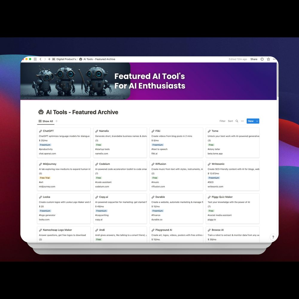 Are you tired of scouring the internet for the best AI tools to help you get your work done faster and more efficiently? Look no further than Featured AI Tools! With 711 of the most essential AI tools available, this Notion template is the perfect resource for professionals looking to enhance their productivity. Whether you're a data analyst, a marketer, or a software developer, the Featured AI Tools template has something for you. From natural language processing and image recognition to data visualization and machine learning, these tools can help you tackle complex tasks and streamline your workflow. With easy-to-use templates and a user-friendly interface, the Featured AI Tools template is perfect for beginners and experts alike. Get started today and discover the power of AI! If you're interested in staying up-to-date on the latest AI news, trends, and tools, be sure to follow us on social media! I regularly share FREE Notion templates, articles, insights, and industry updates on my accounts, so you won't want to miss out. Here are links to our accounts: Follow the opportunities β Join me on my Twitter journey!Free content and tutorials β Jump to my Facebook GroupAre u use Instagram? β Follow meDid it benefit you? β Leave a short testimonialTo browse other products β Grab Free Products Thanks for your support, and let's connect on social media! π€π