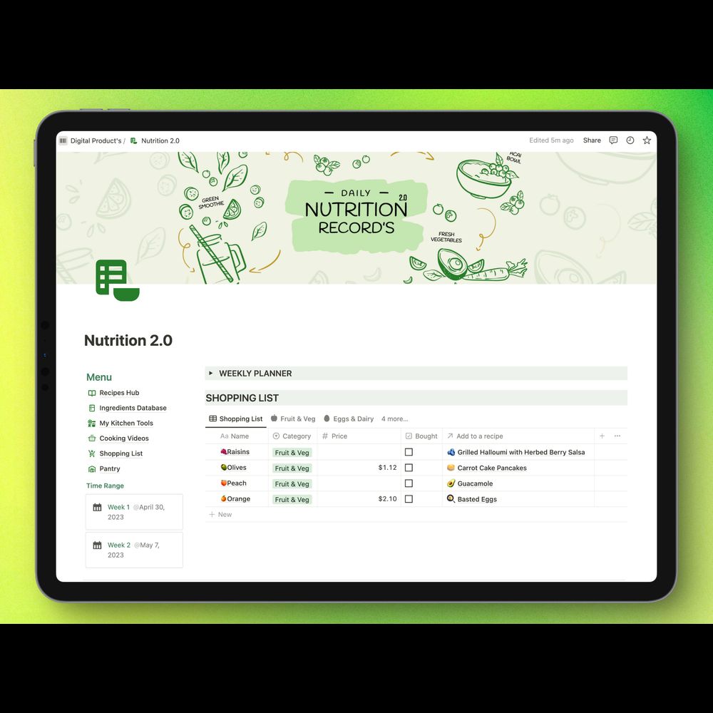Discover a fusion of flavor and functionality with Nutrition 2.0, the ultimate companion for your nutrition journey. The free Recipe Gallery template offers an appetizing assortment of recipes, igniting your culinary imagination and encouraging healthy eating habits. For those seeking the pinnacle of meal planning, Nutrition 2.0 presents an all-encompassing package. Harness the power of the Recipe Gallery alongside the Ingredients Database, My Kitchen Tools, Cooking Videos, Shopping List, and Pantry. Seamlessly integrate flavor, nutrition, and organization into your kitchen routine. Unleash your inner chef, master new techniques, and create harmonious meals that nourish both body and soul. Upgrade to Nutrition 2.0 now and unlock the full potential of your culinary creativity! Features of Recipe Gallery (Free Recipe Gallery Template): Recipe Gallery: Explore a wide variety of mouthwatering recipes curated to suit different tastes and dietary preferences. From quick and easy weekday meals to indulgent weekend treats, find inspiration for every occasion and customize. Features of Nutrition 2.0 ($3.99 Complete Package): Recipe Gallery: Access an extensive collection of recipes, including additional exclusive recipes not available in the free version. Discover exciting new flavors and experiment with diverse cuisines to keep your meals interesting and satisfying.Ingredients Database: Create a comprehensive database of ingredients, allowing you to easily track what goes into your meals. Stay mindful of your nutrition goals, identify allergens, and make informed choices about the ingredients you use.My Kitchen Tools: Equip your kitchen with a virtual toolbox, featuring essential culinary instruments and gadgets. Enhance your cooking experience and ensure you have the right tools at your disposal for efficient meal preparation.Cooking Videos: Learn new cooking techniques and expand your culinary skills through engaging and informative cooking videos. Enhance your confidence in the kitchen and discover innovative ways to elevate your dishes.Shopping List: Stay organized and streamline your grocery shopping experience with a dynamic shopping list. Seamlessly add ingredients from recipes or your customized ingredient database, ensuring you never miss a vital item.Pantry: Keep track of your pantry items and maintain optimal stock levels. Easily check what ingredients you have on hand, reduce food waste, and plan meals based on what's readily available. Advantages of Nutrition 2.0 (over the free version): Unlock the complete package: Gain access to the full suite of features, expanding your ability to plan, track, and optimize your nutrition journey.Exclusive recipes: Enjoy additional exclusive recipes, providing even more customized and inspiration for your meals.Enhanced organization: Utilize the Ingredients Database, My Kitchen Tools, Shopping List, and Pantry pages to seamlessly manage your ingredients, tools, shopping, and pantry inventory.Advanced culinary skills: Learn from Cooking Videos to master new techniques and enhance your cooking skills, taking your meals to the next level.Comprehensive and holistic approach: With Nutrition 2.0, you have all the tools at your disposal to create a well-rounded and efficient nutrition planning system. Upgrade to Nutrition 2.0 now and experience a new level of flavor, functionality, and culinary creativity in your nutrition journey!