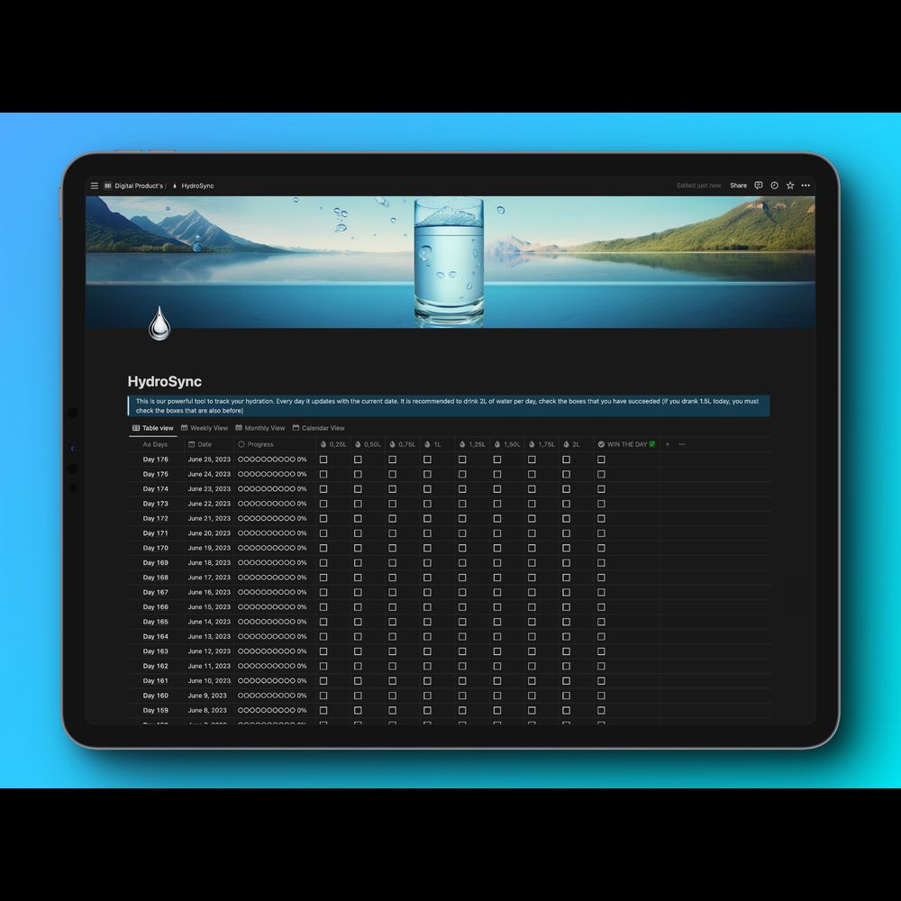 Discover the ultimate hydration companion with HydroSync, a powerful tool designed to revolutionize your water intake tracking. Stay on top of your hydration goals and unlock the potential of optimal well-being. π₯ Features: π‘ Dynamic Table Views: Dive into a comprehensive overview of your hydration progress, with daily breakdowns and intuitive visuals to monitor your water intake effectively. π Weekly View: Zoom out and gain valuable insights into your hydration patterns throughout the week, identifying trends and making adjustments accordingly. ποΈ Monthly View: Track your long-term hydration consistency and witness your progress unfold over time, helping you maintain momentum and stay motivated. π Calendar View: Plan ahead and stay organized with a convenient calendar layout, ensuring you never miss a beat when it comes to your hydration goals. HydroSync simplifies the process of staying adequately hydrated. It updates automatically with the current date, and each day presents you with the recommended target of 2 liters of water intake. Easily check the boxes that correspond to your achievements, visually marking your progress towards optimal hydration. Even if you fall slightly short one day, HydroSync intelligently prompts you to complete the milestones that were missed, ensuring a holistic approach to tracking your water consumption. π§πͺ Embark on a journey towards a healthier, more invigorated you with HydroSync. Drink smarter, stay focused, and let HydroSync be your trusted companion on the path to elevated well-being. Master your hydration game today! π Note: This HydroSync template is in Notion format and requires Notion software to utilize its full functionality. π
