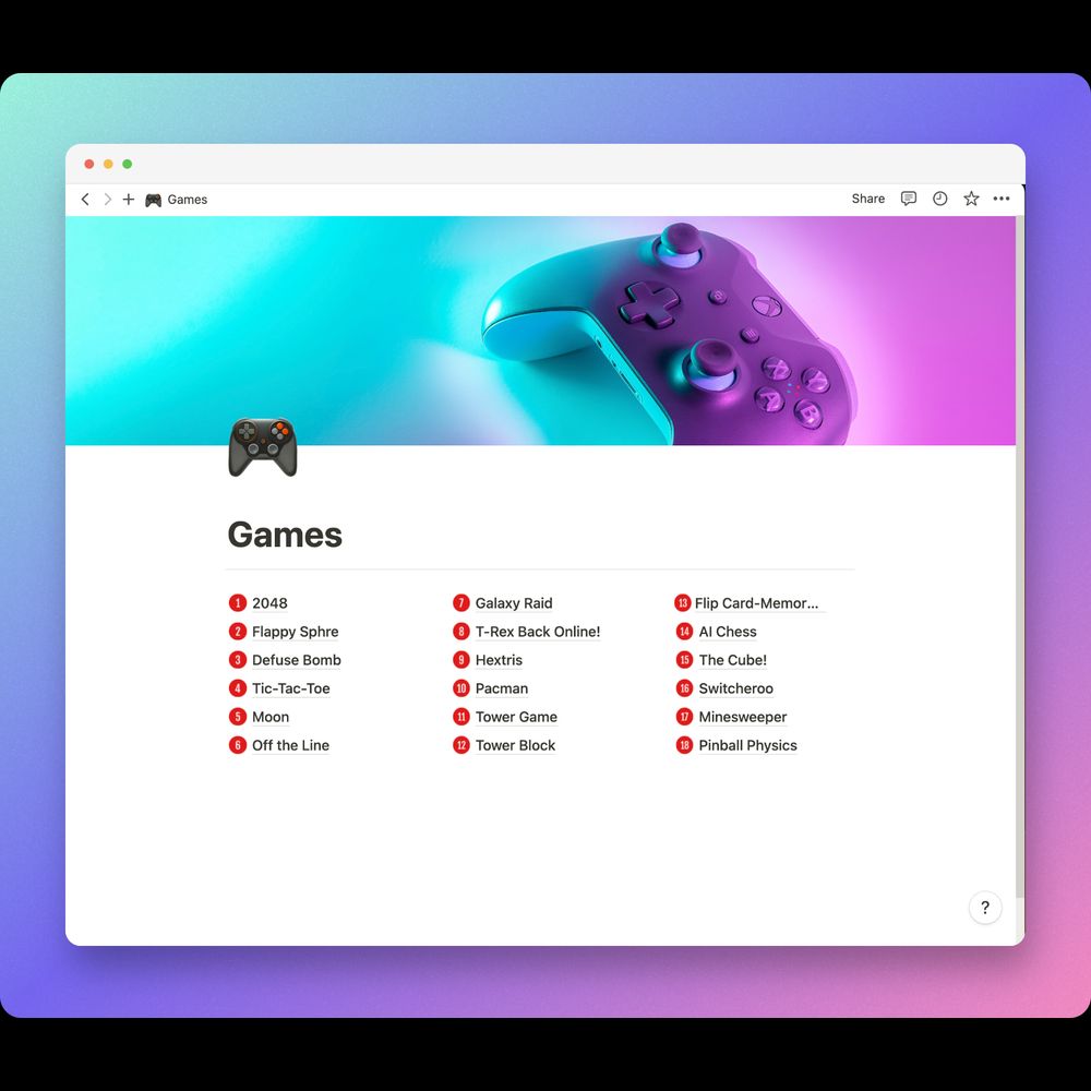 What would it be like to be able to play games without leaving Notion? We all get bored at working sometimes and need a chill out. For this, I collected 11 simple games and prepared a game page. You can get your own copy of Notion for free. If you're interested in staying up-to-date on the latest AI news, trends, and tools, be sure to follow us on social media! I regularly share FREE Notion templates, articles, insights, and industry updates on my accounts, so you won't want to miss out. Here are links to our accounts: Follow the opportunities β Join me on my Twitter journey!Free content and tutorials β Jump to my Facebook GroupAre u use Instagram? β Follow meDid it benefit you? β Leave a short testimonial Thanks for your support, and let's connect on social media! π€π