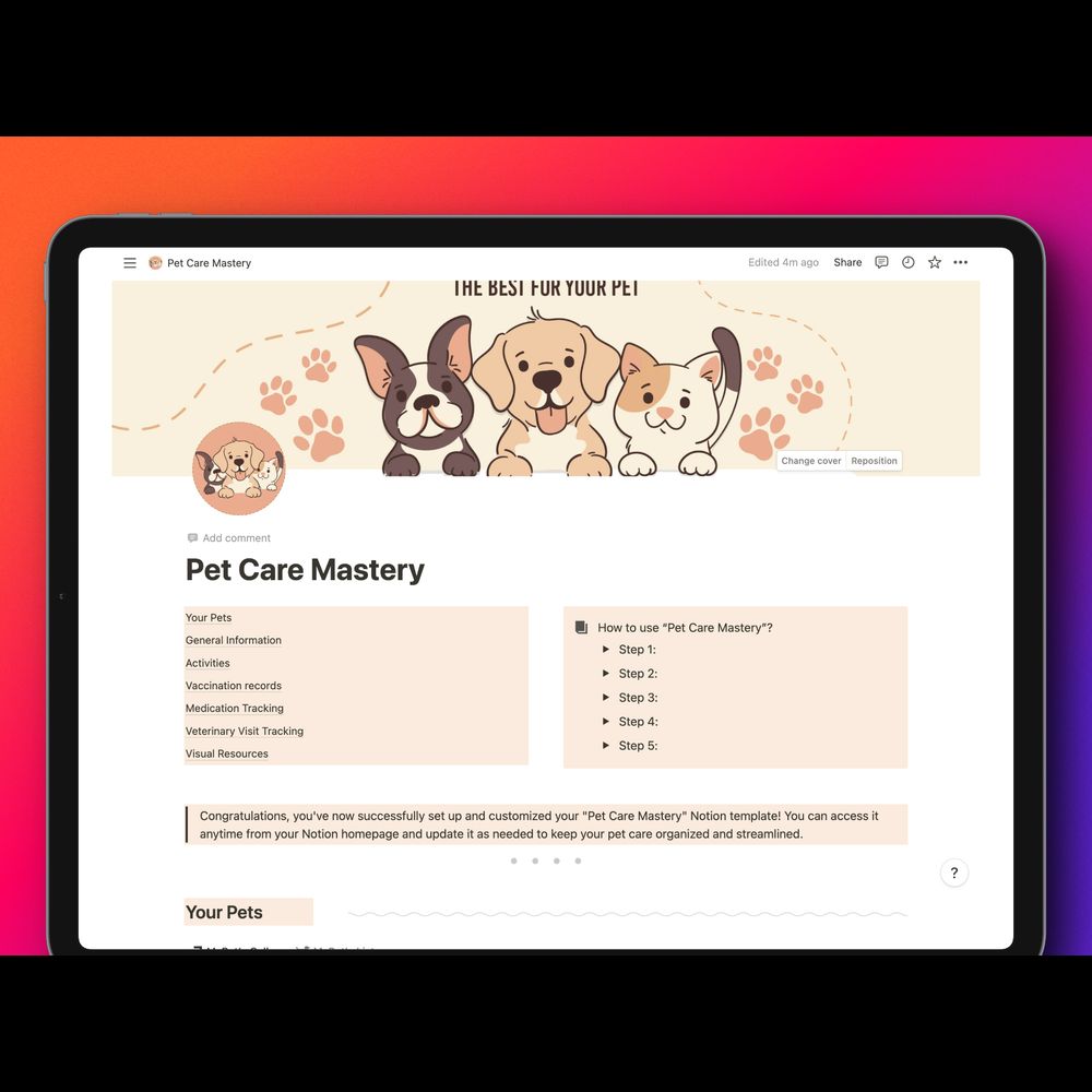 Are you tired of feeling overwhelmed by the demands of taking care of multiple pets? Do you find yourself struggling to keep track of their activity routines, vaccination records, medication schedules, and veterinary appointments? Look no further, because "Pet Care Mastery" is here to help! Our Notion template is designed to make life as a multi-pet owner a breeze. With easy-to-use tables and cards, you can keep all your pet-related information in one place. The "Your Pets" section allows you to add your pets' names, photos, and important details. The "General Information" section lets you keep track of each pet's dietary requirements, allergies, and more. The "Activity Routines" section helps you establish consistent exercise and playtime schedules for each pet, while the "Vaccination Records" and "Medication Tracking" sections make it easy to stay on top of your pets' health needs. And with the "Veterinary Visit Tracking" section, you can easily schedule and keep track of your pets' appointments. Simplify your life as a multi-pet owner and become a pet care master with our Notion template. Get started today and make sure your pets receive the care they deserve! If you're interested in staying up-to-date on the latest AI news, trends, and tools, be sure to follow us on social media! I regularly share FREE Notion templates, articles, insights, and industry updates on my accounts, so you won't want to miss out. Here are links to our accounts: Follow the opportunities β Join me on my Twitter journey!Free content and tutorials β Jump to my Facebook GroupAre u use Instagram? β Follow meDid it benefit you? β Leave a short testimonial Thanks for your support, and let's connect on social media! π€π