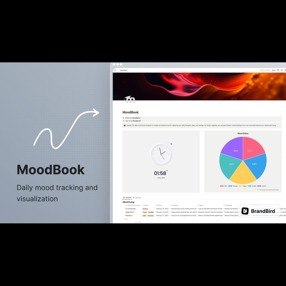 Looking for a way to better manage your thoughts, ideas, and feelings? Look no further than the MoodBook Template - a powerful tool designed to help you capture your daily musings and better understand your own thought patterns. With the MoodBook Template, you'll be able to easily track your daily thoughts and ideas, reflect on your experiences, and gain valuable insights into your own thinking. Whether you're looking to improve your mental clarity, better manage your emotions, or simply keep a record of your daily life, this template has everything you need to get started. So why wait? Start using the MoodBook Template today and take the first step towards a more organized, focused, and productive life. With its intuitive design, customizable features, and easy-to-use interface, it's the perfect tool for anyone looking to stay on top of their mental game. Best of all, the MoodBook Template is available right now as a Notion template, making it easy to access and use from anywhere, at any time. So don't delay - get started today and discover the power of MoodBook for yourself!