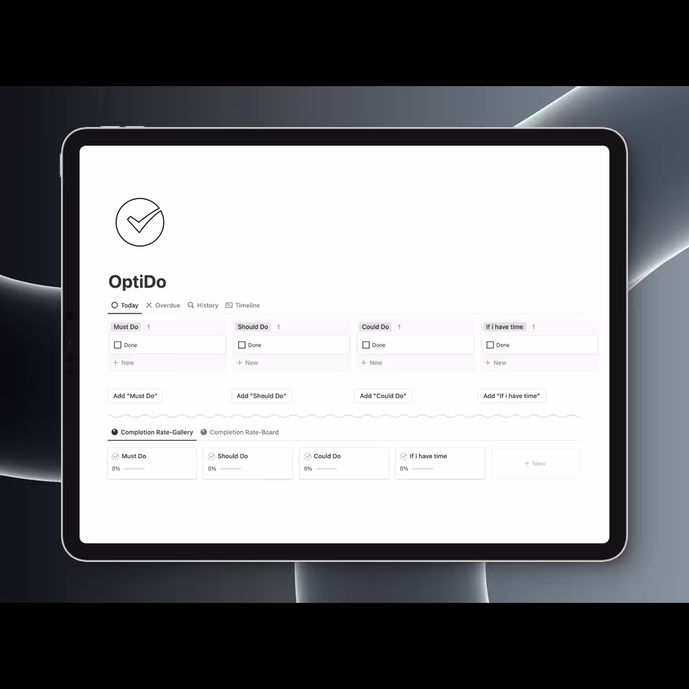 Are you looking for a simple and effective way to manage your tasks and stay productive? Do you want to have a clear and visual overview of your progress and achievements? Do you wish you could organize your daily, weekly and monthly goals with ease? If you said yes to any of these questions, then you need the Notion To-Do List Template. This template is designed to help you plan, track and achieve your goals with ease. It has four main features that make it stand out from other to-do list templates: Four priority levels: You can categorize your tasks into four sections: Must Do, Should Do, Could Do and If I Have Time. This helps you focus on the most important and urgent tasks first, and avoid getting overwhelmed by too many things to do.Completion rate: You can monitor your task completion rate for each section, and see how well you are doing in terms of meeting your deadlines and expectations. This motivates you to keep going and celebrate your achievements.Overdue view: You can see all the tasks that you missed or postponed from the previous days, and decide whether to reschedule them or delete them. This helps you avoid procrastination and keep your to-do list up to date.Timeline view: You can see your tasks in a chronological order, and track how much time you spend on each task. This helps you manage your time more efficiently and optimize your workflow. With this template, you will have everything you need to plan, track and achieve your goals with ease. You will be able to: Create unlimited tasks for any project or categoryAdd notes, tags, due dates, reminders and attachments to your tasksDrag and drop your tasks to rearrange them according to your preferencesMark your tasks as complete or incomplete with a simple clickFilter, sort and search your tasks by various criteriaView your tasks in different modes: Today, Overdue, History or TimelineSync your tasks with Google Calendar or other apps using Notion integrationsCustomize the template to suit your needs and style The Notion To-Do List Template is the perfect solution for anyone who wants to get more done in less time, and have more fun along the way. Whether you are a student, a professional, an entrepreneur or a hobbyist, this template will help you achieve your goals and dreams. FAQ Q: How do I get the Notion To-Do List Template? A: You can get the template by clicking the buy button on this page. You will receive a link to download the template after completing the payment. Q: How do I use the Notion To-Do List Template? A: You can use the template by importing it into your Notion account. You can follow the instructions on this page to learn how to import a template into Notion. Q: How do I customize the Notion To-Do List Template? A: You can customize the template by changing the colors, fonts, icons, images and other elements. You can also add or delete sections, columns, rows and properties as you wish. Q: How do I contact you if I have any questions or feedback? A: You can contact me by sending an email to [your email address]. I will be happy to answer your questions and hear your feedback. Donβt wait any longer. Get the Notion To-Do List Template today and start making things happen!