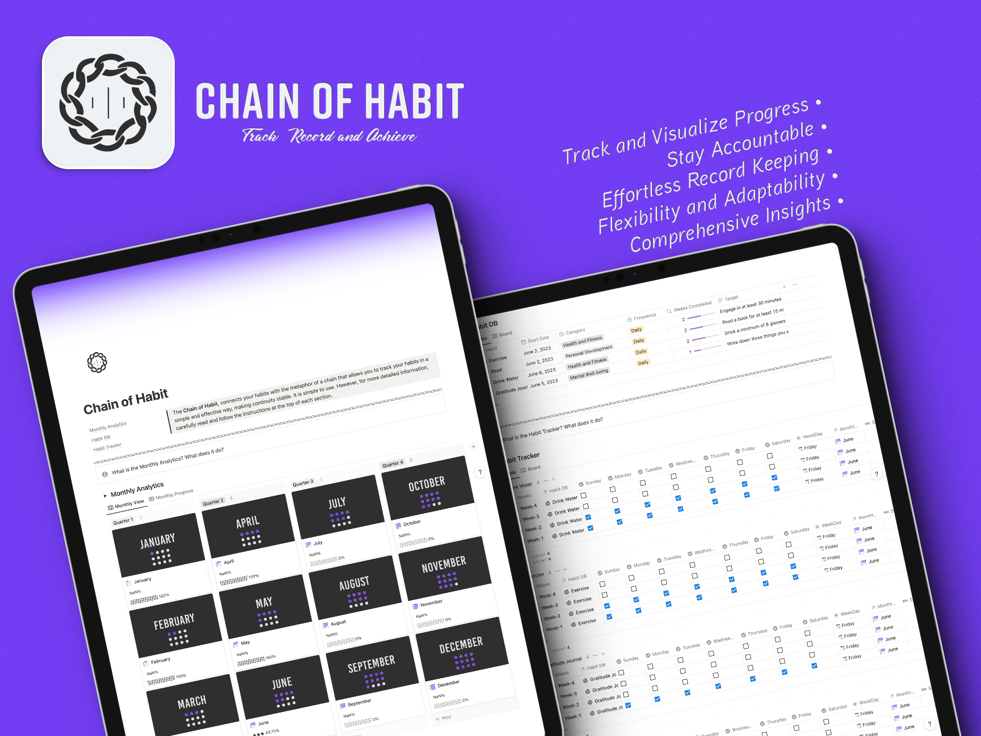 π Discover the Power of Habits with Chain of Habit! Track, Record, and Achieve Your Goals Like Never Before! π Are you tired of struggling to maintain consistency with your habits? Do you find it challenging to stay motivated and track your progress effectively? Look no further! Introducing Chain of Habit, the ultimate digital companion that revolutionizes the way you build and maintain habits. Unleash the potential within you and unlock the key to lasting personal growth. π The Metaphorical Chain of Success π Imagine your habits as links in a powerful chain, connecting your aspirations, dreams, and daily actions. With Chain of Habit, you can effortlessly track and visualize your habits, making continuity stable and progress tangible. Watch as your chain grows stronger with each successful habit, forging an unbreakable path towards success. ποΈ Monthly Analytics: Gain Valuable Insights π The Monthly Analytics feature in Chain of Habit empowers you with a bird's-eye view of your habits. Witness your monthly progress unfold before your eyes as the progress bar calculates how many days have passed, keeping you motivated and accountable. Effortlessly add new habits and watch them seamlessly integrate into your monthly progress, creating a comprehensive snapshot of your journey. π‘ Habit DB: Your Personal Record Keeper π Kickstart your habit-building journey with the Habit DB database. This is where your record-keeping and tracking begin. Easily add habits with the click of a button, specifying their category, frequency, start date, and goal. With two visually appealing and user-friendly views to choose from, Habit DB ensures you stay organized and focused on your goals. Get ready to embrace positive change! π Habit Tracker: Stay on Course, Stay Committed π― Track your habits effectively with the Habit Tracker database. Filtered on a monthly basis, this powerful tool showcases your habits for the current month, neatly grouped for clarity. Mark daily checkboxes to keep yourself accountable and motivated. If a habit no longer serves you, delete it effortlessly, ensuring a clutter-free and streamlined tracking experience. Your habits are just a few taps away! π The "New Habit" Page: Your Personal Habit Hub π Each habit deserves its own dedicated space, and the "New Habit" page in Chain of Habit provides just that. Fill in vital habit information, then create a monthly cycle to gain a clear view of your progress. Dive into the Daily View, where weekly checkboxes await your triumphs. Explore the Weekly View for a comprehensive progress overview. The SkipDay View lets you plan for flexibility, while the Monthly View celebrates your achievements on a grand scale. β¨ A Journey of Self-Discovery and Growth β¨ Embark on a transformative journey with Chain of Habit. Explore the vast depths of habit research, immerse yourself in inspiring stories of triumph, and tap into the power of consistency. Let this meticulously crafted digital template be your guiding light as you unlock your true potential and transform your life, one habit at a time. π Take Control of Your Destiny Today! π With Chain of Habit, you hold the key to lasting change. Embrace the power of habits, unlock your potential, and witness remarkable transformations in all areas of your life. Don't let procrastination and inconsistency hold you back any longer. Begin your journey now and become the best version of yourself. The time for change is hereβseize it with Chain of Habit! π Unlock the Power of Consistency - Purchase Chain of Habit Now! π If you're interested in staying up-to-date on the latest AI news, trends, and Notion tools, be sure to follow us on social media! I regularly share FREE Notion templates, articles, insights, and industry updates on my accounts, so you won't want to miss out. Here are links to our accounts: Follow the opportunities β Join me on my Twitter journey!Free content and tutorials β Jump to my Facebook GroupAre u use Instagram? β Follow meDid it benefit you? β Leave a short testimonial Thanks for your support, and let's connect on social media! π€π