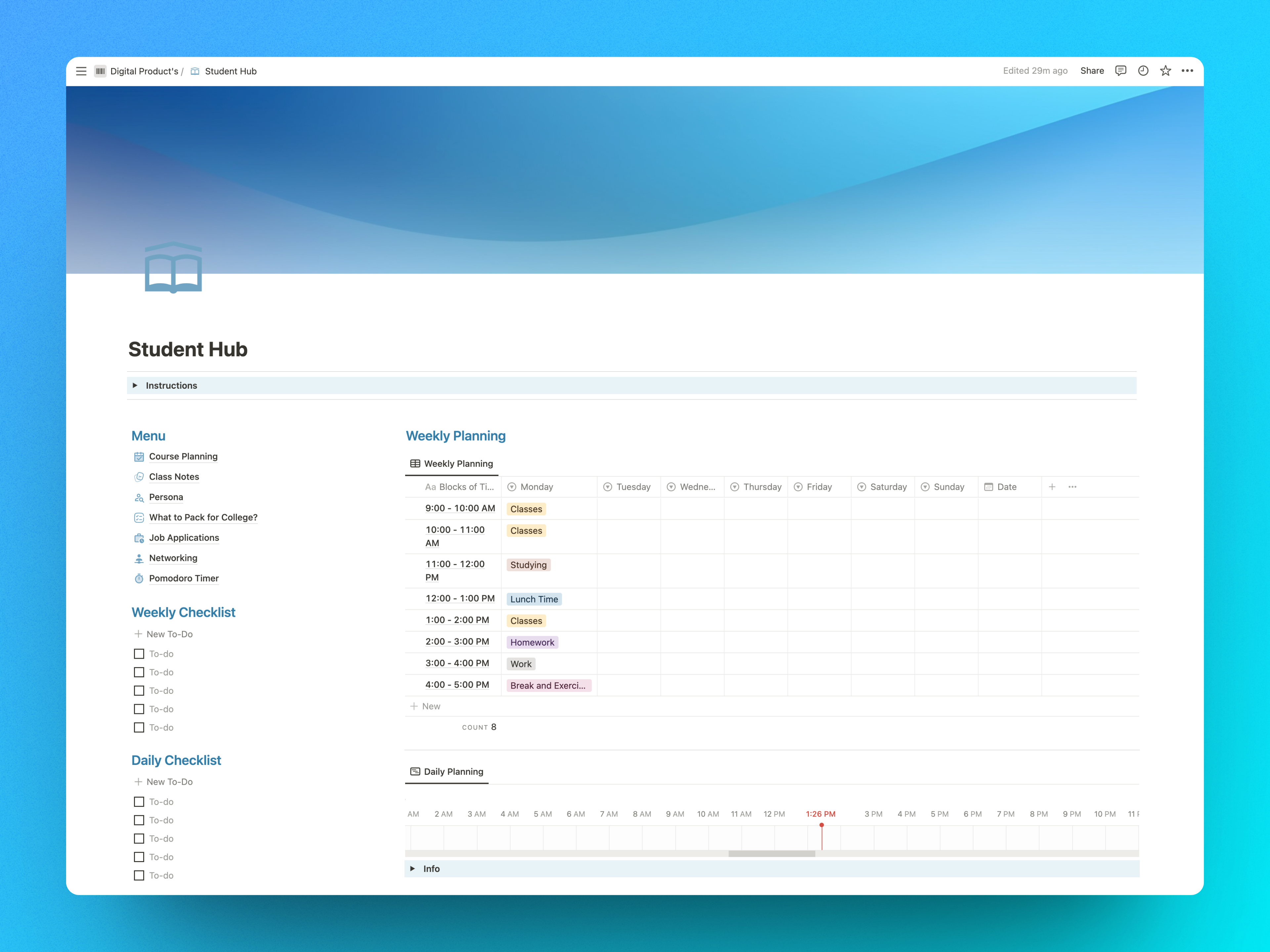 Are you a student looking to level up your organizational game and maximize your academic success? Look no further than "Student Hub," a meticulously designed Notion template created with your needs in mind. This digital toolkit serves as your ultimate companion, offering a range of essential pages and features to streamline your student life. Course Planning: Stay on top of your classes with this dedicated page that helps you map out your semesters, track credits, and plan your study schedule.Class Notes: Effortlessly organize and access your lecture notes, readings, and study materials all in one place. Take advantage of powerful tools for effective note-taking and revision.Persona (in resume): Craft a compelling resume that highlights your unique skills and experiences, tailored specifically for the job or internship you're targeting.What to Pack for College?: Get a comprehensive checklist of all the essentials you need to pack before heading off to college, ensuring a smooth transition to campus life.Job Applications: Simplify your job application process with a dedicated page that helps you keep track of job openings, application deadlines, and your progress in the hiring process.Networking: Build valuable connections with peers, mentors, and professionals in your field. Utilize this page to track your networking efforts, record important contacts, and schedule informational interviews.Pomodoro Timer: Boost your productivity and manage your time effectively with a built-in Pomodoro Timer, allowing you to work in focused bursts and take well-deserved breaks. Additionally, our homepage features calendars and checklists for seamless weekly and daily planning, ensuring you stay organized and motivated throughout the academic year. Get your hands on the "Student Hub" template today and unlock the potential to excel academically. Best of all, it's completely free! Download now and embrace the power of organization in your student life.