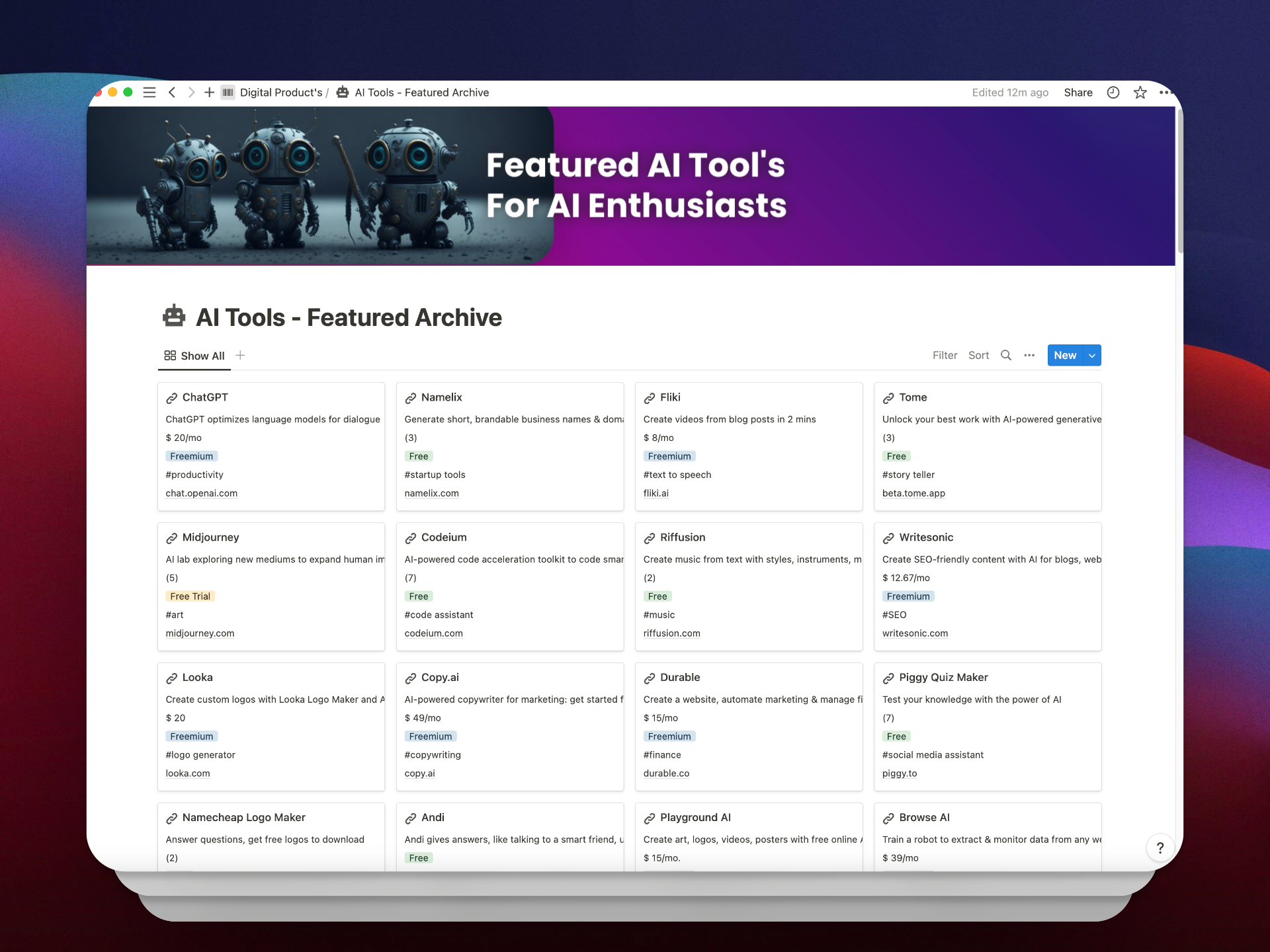 Are you tired of scouring the internet for the best AI tools to help you get your work done faster and more efficiently? Look no further than Featured AI Tools! With 711 of the most essential AI tools available, this Notion template is the perfect resource for professionals looking to enhance their productivity. Whether you're a data analyst, a marketer, or a software developer, the Featured AI Tools template has something for you. From natural language processing and image recognition to data visualization and machine learning, these tools can help you tackle complex tasks and streamline your workflow. With easy-to-use templates and a user-friendly interface, the Featured AI Tools template is perfect for beginners and experts alike. Get started today and discover the power of AI! If you're interested in staying up-to-date on the latest AI news, trends, and tools, be sure to follow us on social media! I regularly share FREE Notion templates, articles, insights, and industry updates on my accounts, so you won't want to miss out. Here are links to our accounts: Follow the opportunities β Join me on my Twitter journey!Free content and tutorials β Jump to my Facebook GroupAre u use Instagram? β Follow meDid it benefit you? β Leave a short testimonialTo browse other products β Grab Free Products Thanks for your support, and let's connect on social media! π€π