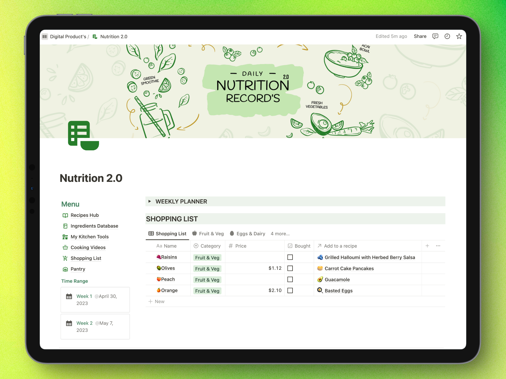 Discover a fusion of flavor and functionality with Nutrition 2.0, the ultimate companion for your nutrition journey. The free Recipe Gallery template offers an appetizing assortment of recipes, igniting your culinary imagination and encouraging healthy eating habits. For those seeking the pinnacle of meal planning, Nutrition 2.0 presents an all-encompassing package. Harness the power of the Recipe Gallery alongside the Ingredients Database, My Kitchen Tools, Cooking Videos, Shopping List, and Pantry. Seamlessly integrate flavor, nutrition, and organization into your kitchen routine. Unleash your inner chef, master new techniques, and create harmonious meals that nourish both body and soul. Upgrade to Nutrition 2.0 now and unlock the full potential of your culinary creativity! Features of Recipe Gallery (Free Recipe Gallery Template): Recipe Gallery: Explore a wide variety of mouthwatering recipes curated to suit different tastes and dietary preferences. From quick and easy weekday meals to indulgent weekend treats, find inspiration for every occasion and customize. Features of Nutrition 2.0 ($3.99 Complete Package): Recipe Gallery: Access an extensive collection of recipes, including additional exclusive recipes not available in the free version. Discover exciting new flavors and experiment with diverse cuisines to keep your meals interesting and satisfying.Ingredients Database: Create a comprehensive database of ingredients, allowing you to easily track what goes into your meals. Stay mindful of your nutrition goals, identify allergens, and make informed choices about the ingredients you use.My Kitchen Tools: Equip your kitchen with a virtual toolbox, featuring essential culinary instruments and gadgets. Enhance your cooking experience and ensure you have the right tools at your disposal for efficient meal preparation.Cooking Videos: Learn new cooking techniques and expand your culinary skills through engaging and informative cooking videos. Enhance your confidence in the kitchen and discover innovative ways to elevate your dishes.Shopping List: Stay organized and streamline your grocery shopping experience with a dynamic shopping list. Seamlessly add ingredients from recipes or your customized ingredient database, ensuring you never miss a vital item.Pantry: Keep track of your pantry items and maintain optimal stock levels. Easily check what ingredients you have on hand, reduce food waste, and plan meals based on what's readily available. Advantages of Nutrition 2.0 (over the free version): Unlock the complete package: Gain access to the full suite of features, expanding your ability to plan, track, and optimize your nutrition journey.Exclusive recipes: Enjoy additional exclusive recipes, providing even more customized and inspiration for your meals.Enhanced organization: Utilize the Ingredients Database, My Kitchen Tools, Shopping List, and Pantry pages to seamlessly manage your ingredients, tools, shopping, and pantry inventory.Advanced culinary skills: Learn from Cooking Videos to master new techniques and enhance your cooking skills, taking your meals to the next level.Comprehensive and holistic approach: With Nutrition 2.0, you have all the tools at your disposal to create a well-rounded and efficient nutrition planning system. Upgrade to Nutrition 2.0 now and experience a new level of flavor, functionality, and culinary creativity in your nutrition journey!