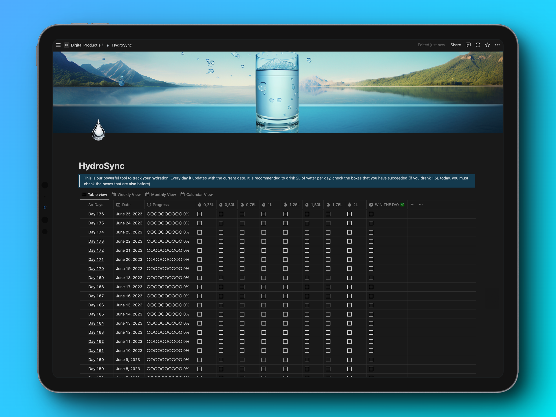 Discover the ultimate hydration companion with HydroSync, a powerful tool designed to revolutionize your water intake tracking. Stay on top of your hydration goals and unlock the potential of optimal well-being. π₯ Features: π‘ Dynamic Table Views: Dive into a comprehensive overview of your hydration progress, with daily breakdowns and intuitive visuals to monitor your water intake effectively. π Weekly View: Zoom out and gain valuable insights into your hydration patterns throughout the week, identifying trends and making adjustments accordingly. ποΈ Monthly View: Track your long-term hydration consistency and witness your progress unfold over time, helping you maintain momentum and stay motivated. π Calendar View: Plan ahead and stay organized with a convenient calendar layout, ensuring you never miss a beat when it comes to your hydration goals. HydroSync simplifies the process of staying adequately hydrated. It updates automatically with the current date, and each day presents you with the recommended target of 2 liters of water intake. Easily check the boxes that correspond to your achievements, visually marking your progress towards optimal hydration. Even if you fall slightly short one day, HydroSync intelligently prompts you to complete the milestones that were missed, ensuring a holistic approach to tracking your water consumption. π§πͺ Embark on a journey towards a healthier, more invigorated you with HydroSync. Drink smarter, stay focused, and let HydroSync be your trusted companion on the path to elevated well-being. Master your hydration game today! π Note: This HydroSync template is in Notion format and requires Notion software to utilize its full functionality. π