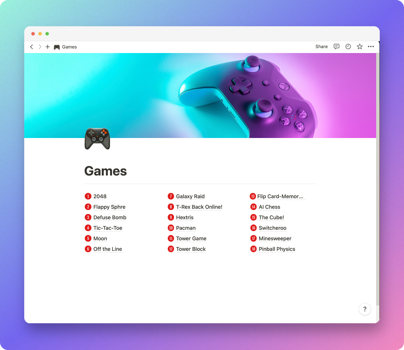 What would it be like to be able to play games without leaving Notion? We all get bored at working sometimes and need a chill out. For this, I collected 11 simple games and prepared a game page. You can get your own copy of Notion for free. If you're interested in staying up-to-date on the latest AI news, trends, and tools, be sure to follow us on social media! I regularly share FREE Notion templates, articles, insights, and industry updates on my accounts, so you won't want to miss out. Here are links to our accounts: Follow the opportunities β Join me on my Twitter journey!Free content and tutorials β Jump to my Facebook GroupAre u use Instagram? β Follow meDid it benefit you? β Leave a short testimonial Thanks for your support, and let's connect on social media! π€π