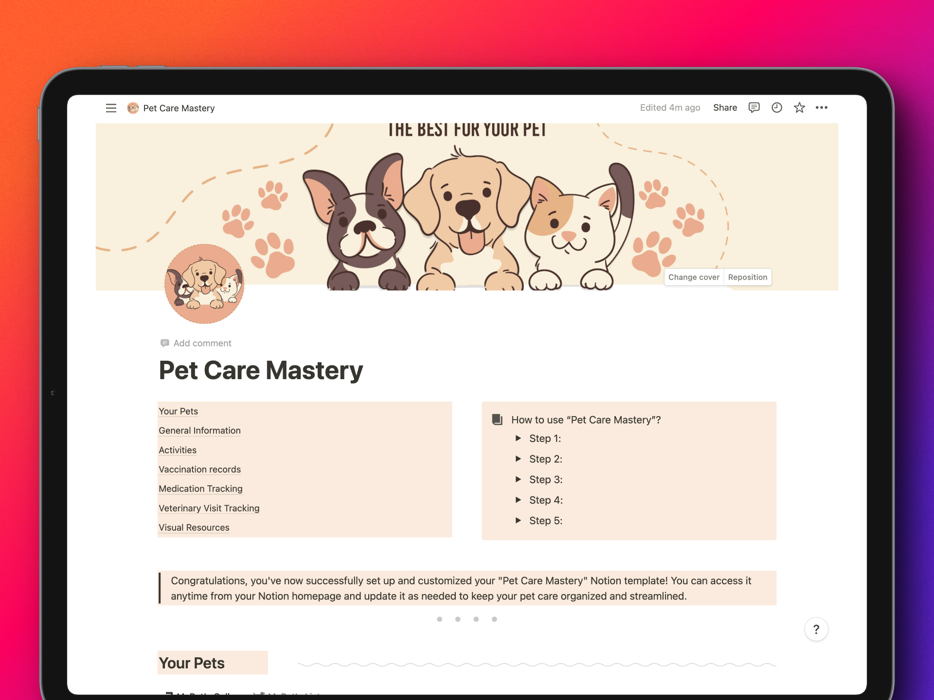 Are you tired of feeling overwhelmed by the demands of taking care of multiple pets? Do you find yourself struggling to keep track of their activity routines, vaccination records, medication schedules, and veterinary appointments? Look no further, because "Pet Care Mastery" is here to help! Our Notion template is designed to make life as a multi-pet owner a breeze. With easy-to-use tables and cards, you can keep all your pet-related information in one place. The "Your Pets" section allows you to add your pets' names, photos, and important details. The "General Information" section lets you keep track of each pet's dietary requirements, allergies, and more. The "Activity Routines" section helps you establish consistent exercise and playtime schedules for each pet, while the "Vaccination Records" and "Medication Tracking" sections make it easy to stay on top of your pets' health needs. And with the "Veterinary Visit Tracking" section, you can easily schedule and keep track of your pets' appointments. Simplify your life as a multi-pet owner and become a pet care master with our Notion template. Get started today and make sure your pets receive the care they deserve! If you're interested in staying up-to-date on the latest AI news, trends, and tools, be sure to follow us on social media! I regularly share FREE Notion templates, articles, insights, and industry updates on my accounts, so you won't want to miss out. Here are links to our accounts: Follow the opportunities β Join me on my Twitter journey!Free content and tutorials β Jump to my Facebook GroupAre u use Instagram? β Follow meDid it benefit you? β Leave a short testimonial Thanks for your support, and let's connect on social media! π€π
