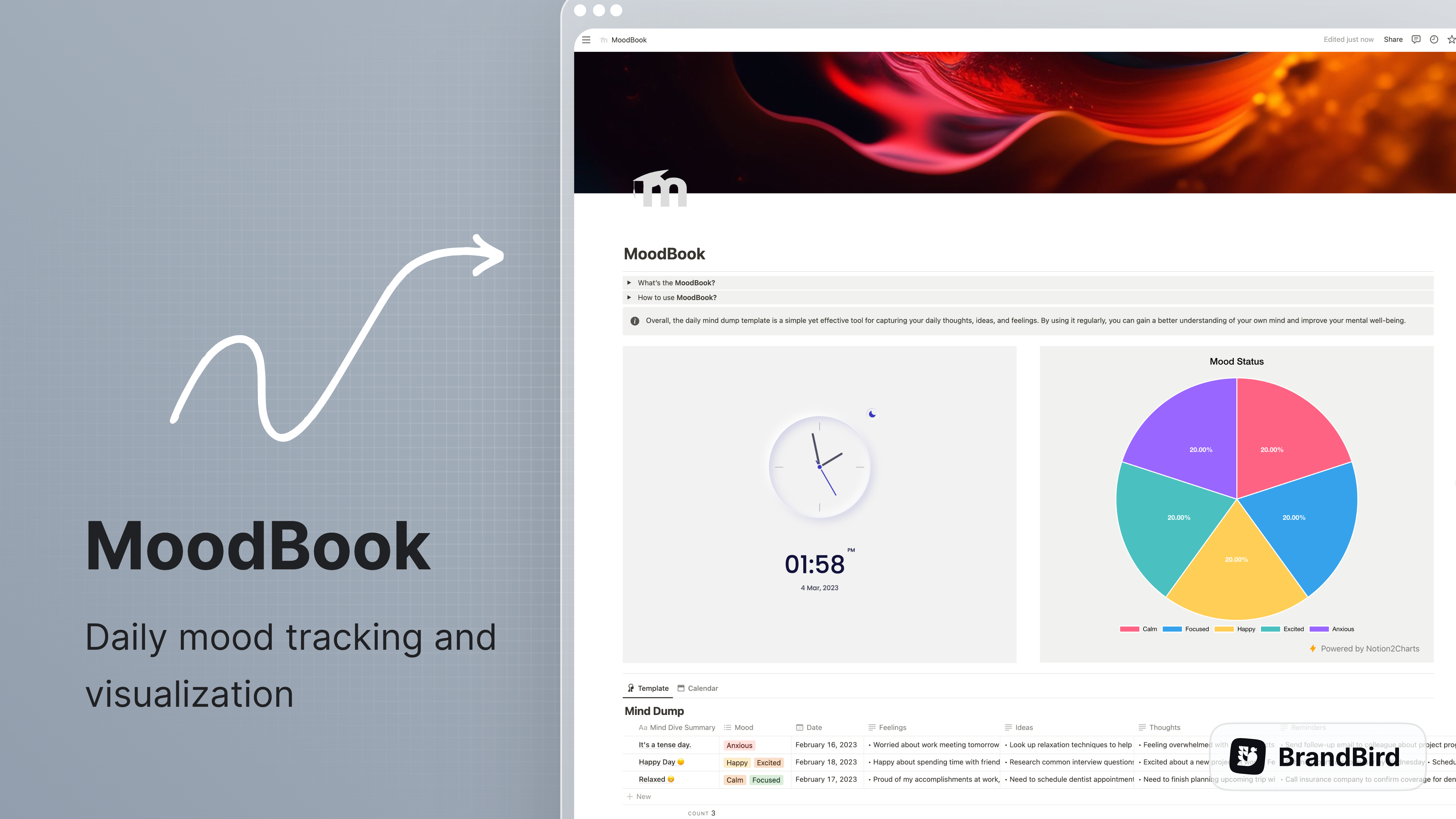 Looking for a way to better manage your thoughts, ideas, and feelings? Look no further than the MoodBook Template - a powerful tool designed to help you capture your daily musings and better understand your own thought patterns. With the MoodBook Template, you'll be able to easily track your daily thoughts and ideas, reflect on your experiences, and gain valuable insights into your own thinking. Whether you're looking to improve your mental clarity, better manage your emotions, or simply keep a record of your daily life, this template has everything you need to get started. So why wait? Start using the MoodBook Template today and take the first step towards a more organized, focused, and productive life. With its intuitive design, customizable features, and easy-to-use interface, it's the perfect tool for anyone looking to stay on top of their mental game. Best of all, the MoodBook Template is available right now as a Notion template, making it easy to access and use from anywhere, at any time. So don't delay - get started today and discover the power of MoodBook for yourself!