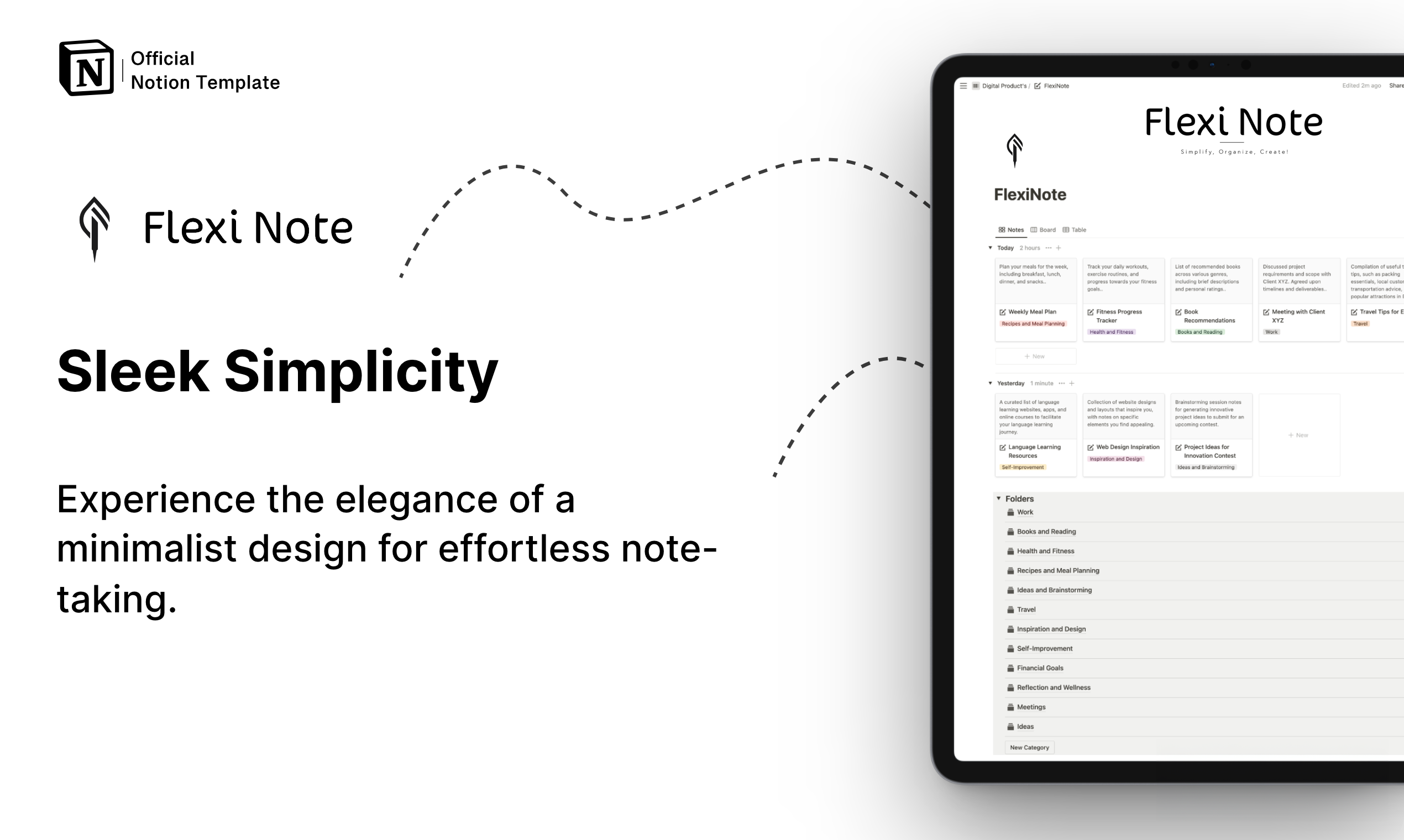 β¨ Tired of messy note-taking in Notion? Say hello to FlexiNote, the ultimate game-changer! β¨ π Dive into the world of effortless organization and creativity with our meticulously crafted Notion template. FlexiNote is here to revolutionize your note-taking journey, providing a seamless and intuitive interface that will skyrocket your productivity! π π₯ What Will You Get?When you purchase FlexiNote, you'll receive instant access to a downloadable Notion template file. This file unlocks a treasure trove of pre-designed pages, sections, and a flexible structure that you can effortlessly customize to suit your unique needs. It's a one-time purchase, granting you lifetime access to the template and all future updates. π π How to Get Your Hands on FlexiNote: Hit that "I want this!" button, and let the magic begin! πFollow the prompts in our secure checkout process.As soon as your payment is confirmed, a download link will be yours to unlock the FlexiNote template file. π π How to Unleash the Power of FlexiNote: Download the FlexiNote template file from the provided link. π₯Import the template seamlessly into your Notion workspace using the import feature.Marvel at the pre-designed pages and sections, ready for your thoughts and ideas to take flight. β¨Customize the template to your heart's content, rearranging, adding, or deleting sections with a simple click. πͺLet the magic happen as FlexiNote elevates your note-taking game, simplifying and supercharging your organizational journey. π₯ Upgrade Your Note-Taking Game Today:Experience the thrill of organized thinking and supercharged creativity with FlexiNote. π Simplify your life, declutter your mind, and embrace a whole new level of productivity! β‘ Don't wait! Grab FlexiNote now and unlock your note-taking potential! β‘ β Note: FlexiNote requires a Notion account for optimal usage. If you haven't already, sign up for a free account at notion.so before diving into the world of FlexiNote. π Need Assistance or Have Questions?Our dedicated support team is here to help you make the most of FlexiNote! Reach out to us at [email protected]. We're thrilled to guide you on your note-taking journey! π Get ready to revolutionize your note-taking experience with FlexiNote. Embrace the power of organized thinking and unlock your full potential! Purchase now and embark on an extraordinary note-taking adventure! π