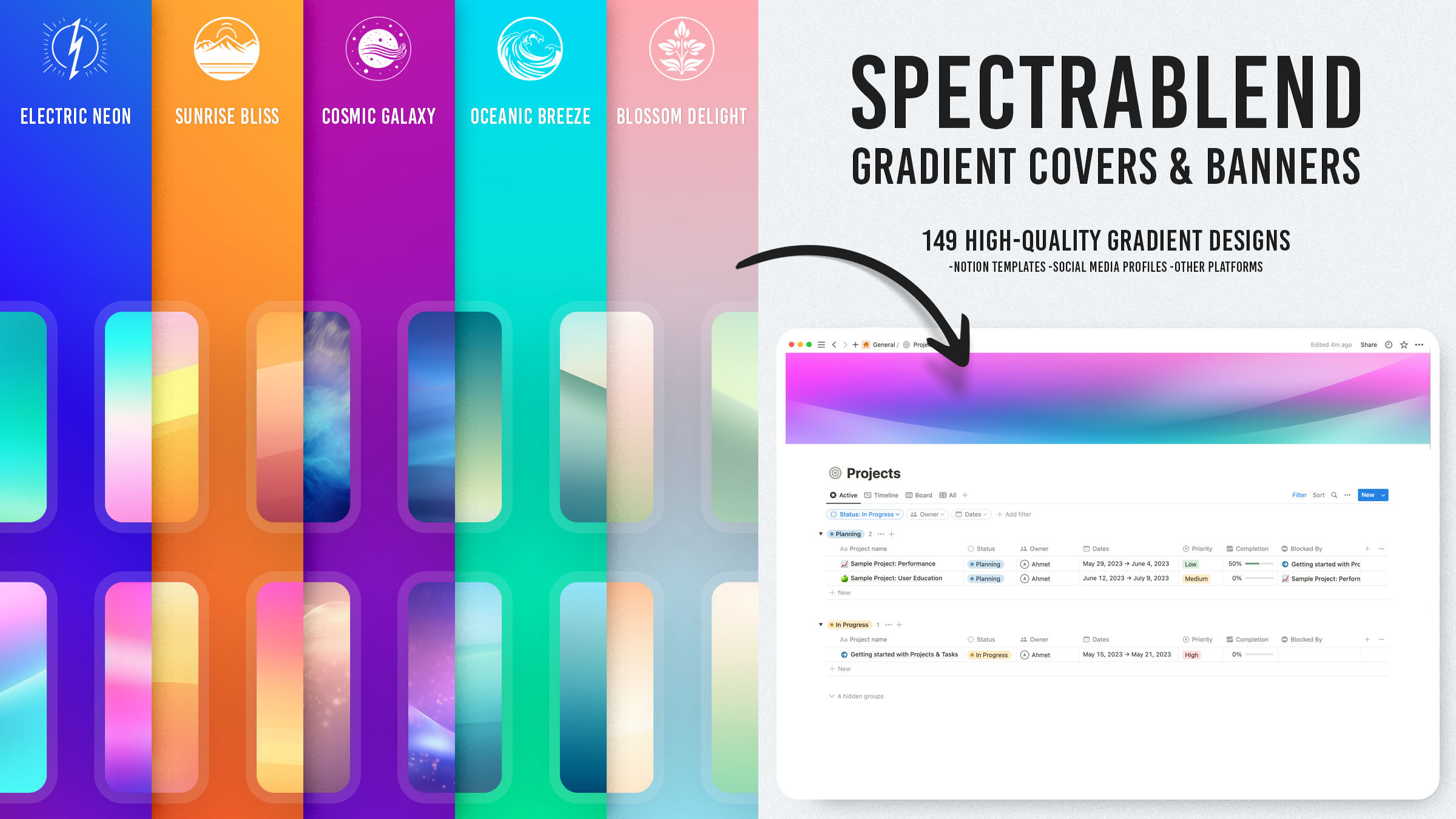 Elevate your creative projects with the mesmerizing Vibrant Gradient Collection. This meticulously curated digital product offers a diverse selection of stunning cover images and banners, designed to transform your Notion templates, social media profiles, and other platforms into captivating visual experiences. Unleash your creativity with an extensive collection of 149 high-quality gradient designs. Let's dive into the exquisite details of each gradient concept: π Cosmic Galaxy: Immerse yourself in the depths of the universe with 26 alluring gradient pieces. These cosmic-inspired blends of deep purples, blues, silver, and gold will transport your viewers into a realm of mystery and enchantment. πΈ Blossom Delight: Blossom Delight brings the delicate beauty of blooming flowers to your projects. Explore 49 exquisite gradient pieces featuring soft pastel pinks, lavenders, and light greens, creating an ambiance of grace, freshness, and natural elegance. π₯ Electric Neon: Make a bold statement with 35 vibrant gradient pieces in Electric Neon. These intense shades of blue, green, and pink will electrify your designs, instantly grabbing attention and leaving a lasting impression. π Oceanic Breeze: Indulge in the soothing serenity of 21 gradient pieces inspired by the oceanic breeze. These harmonious blends of blues and greens will infuse your covers with a calming atmosphere, perfect for achieving a tranquil and refreshing visual aesthetic. π Sunrise Bliss: Capture the essence of a new day with 18 gradient pieces that radiate optimism and energy. Sunrise Bliss combines warm hues of orange, pink, and yellow in seamless transitions, infusing your covers with a vibrant and uplifting spirit. Each gradient piece in the Vibrant Gradient Collection is meticulously designed in a 4:1 ratio, optimized for Notion templates, and boasts a high-resolution of 2176x544 pixels. This ensures exceptional image quality across various platforms, whether you're using them as covers in your Notion workspace, showcasing your brand on social media, or enhancing other digital services. Unlock the full potential of your creative projects and captivate your audience with these mesmerizing gradient covers and banners. Stand out from the crowd, spark inspiration, and make a lasting impact. The Vibrant Gradient Collection includes a comprehensive selection of 149 gradient cover images, featuring 26 Cosmic Galaxy pieces, 49 Blossom Delight pieces, 35 Electric Neon pieces, 21 Oceanic Breeze pieces, and 18 Sunrise Bliss pieces. These assets are perfect for Notion templates, social media profiles, and various digital platforms. Don't miss this opportunity to transform your designs. Download the Vibrant Gradient Collection now and embark on a visual journey that will influence, inspire, and elevate your creative endeavors.