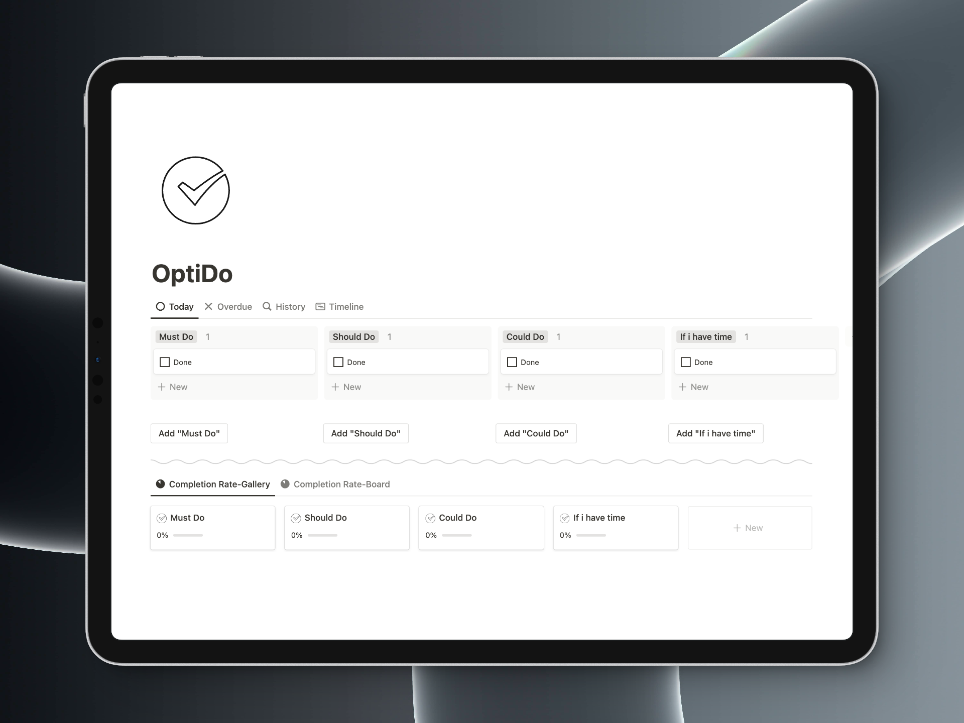 Are you looking for a simple and effective way to manage your tasks and stay productive? Do you want to have a clear and visual overview of your progress and achievements? Do you wish you could organize your daily, weekly and monthly goals with ease? If you said yes to any of these questions, then you need the Notion To-Do List Template. This template is designed to help you plan, track and achieve your goals with ease. It has four main features that make it stand out from other to-do list templates: Four priority levels: You can categorize your tasks into four sections: Must Do, Should Do, Could Do and If I Have Time. This helps you focus on the most important and urgent tasks first, and avoid getting overwhelmed by too many things to do.Completion rate: You can monitor your task completion rate for each section, and see how well you are doing in terms of meeting your deadlines and expectations. This motivates you to keep going and celebrate your achievements.Overdue view: You can see all the tasks that you missed or postponed from the previous days, and decide whether to reschedule them or delete them. This helps you avoid procrastination and keep your to-do list up to date.Timeline view: You can see your tasks in a chronological order, and track how much time you spend on each task. This helps you manage your time more efficiently and optimize your workflow. With this template, you will have everything you need to plan, track and achieve your goals with ease. You will be able to: Create unlimited tasks for any project or categoryAdd notes, tags, due dates, reminders and attachments to your tasksDrag and drop your tasks to rearrange them according to your preferencesMark your tasks as complete or incomplete with a simple clickFilter, sort and search your tasks by various criteriaView your tasks in different modes: Today, Overdue, History or TimelineSync your tasks with Google Calendar or other apps using Notion integrationsCustomize the template to suit your needs and style The Notion To-Do List Template is the perfect solution for anyone who wants to get more done in less time, and have more fun along the way. Whether you are a student, a professional, an entrepreneur or a hobbyist, this template will help you achieve your goals and dreams. FAQ Q: How do I get the Notion To-Do List Template? A: You can get the template by clicking the buy button on this page. You will receive a link to download the template after completing the payment. Q: How do I use the Notion To-Do List Template? A: You can use the template by importing it into your Notion account. You can follow the instructions on this page to learn how to import a template into Notion. Q: How do I customize the Notion To-Do List Template? A: You can customize the template by changing the colors, fonts, icons, images and other elements. You can also add or delete sections, columns, rows and properties as you wish. Q: How do I contact you if I have any questions or feedback? A: You can contact me by sending an email to [your email address]. I will be happy to answer your questions and hear your feedback. Donβt wait any longer. Get the Notion To-Do List Template today and start making things happen!